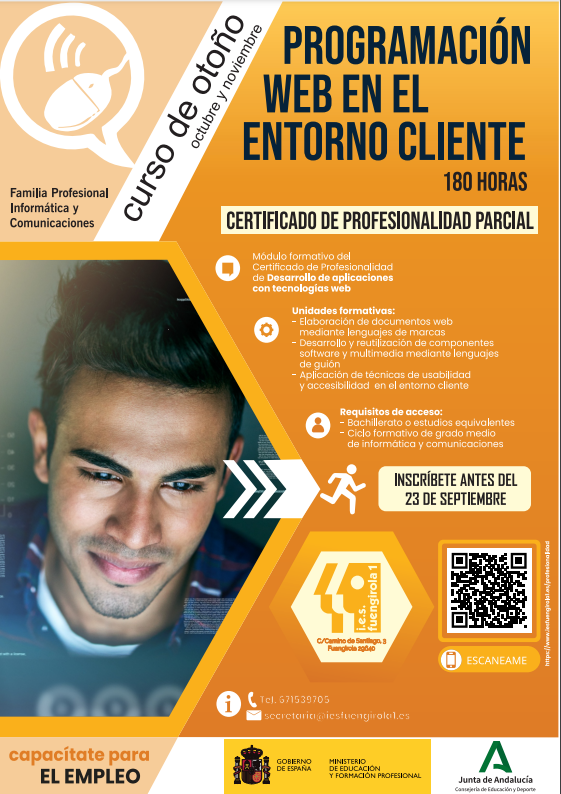 Durante los meses de Octubre y noviembre podrás cursar el certificado de profesionalidad Programación WEB en el Entorno Cliente, aprovecha la oportunidad, te esperamos.