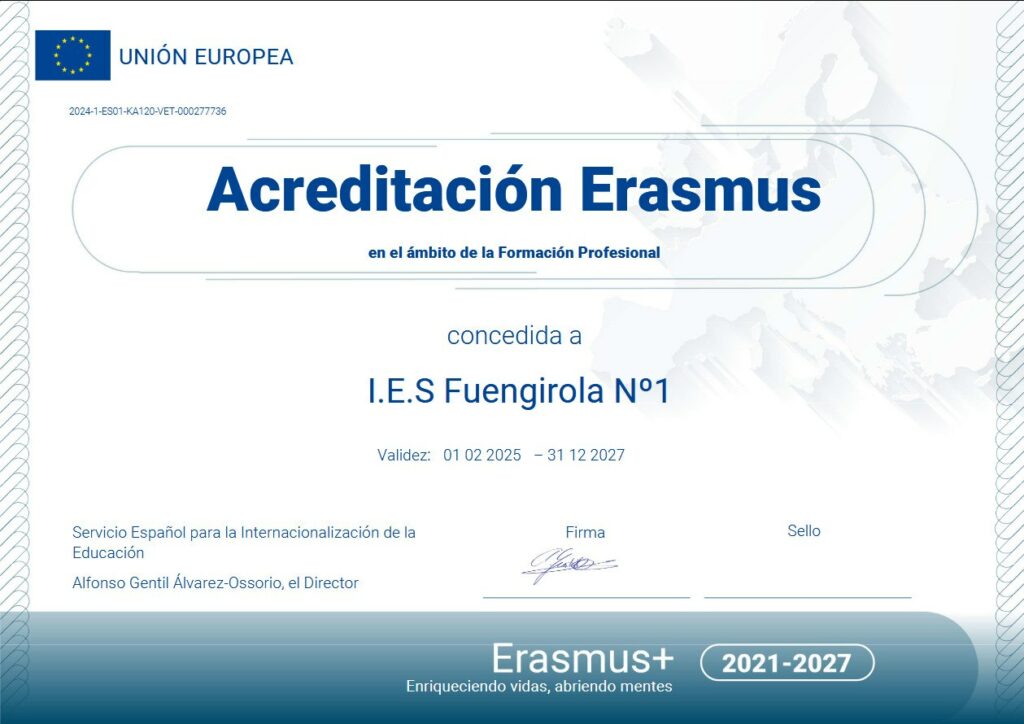 El IES Fuengirola Número 1 es un centro comprometido con la innovación educativa y con los valores europeos —participación democrática, sostenibilidad, cooperación intercultural, entre otros. Fruto de este compromiso es la obtención de las Acreditaciones Erasmus+ en los ámbitos de la Formación Profesional (KA120-VET) y la Educación Superior (Carta ECHE), lo que nos permite desarrollar proyectos europeos de movilidad para el alumnado y profesorado de todos nuestros ciclos formativos.