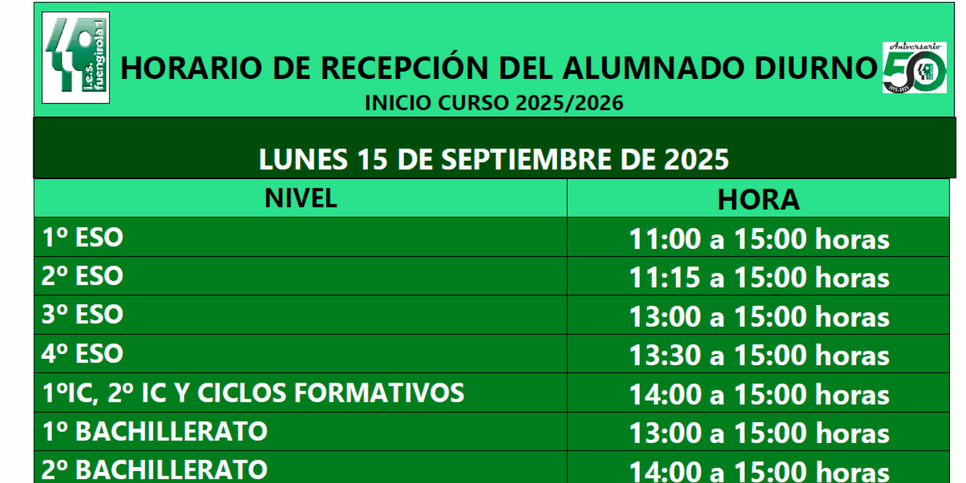 Sep102025JefaturaCUADRO-TABLON-RECEPCION-ALUMNADO.2025-2026-DIURNOCategoría: Jefaturaseptiembre 10, 2025 Comparte esta noticia Share on FacebookShare on Facebook Share on XShare on X TweetShare on Pinterest Share on WhatsAppShare on WhatsApp Share on LinkedInShare on LinkedIn Navegación entre publicacionesAnteriorPublicación anterior:Calendario exámenes Septiembre 2025. 1º Bachillerato Diurno y AdultosSiguientePublicación siguiente:HORARIO DE RECEPCIÓN DEL ALUMNADO ADULTO INICIO CURSO 2025/2026Noticias relacionadasHORARIO DE RECEPCIÓN DEL ALUMNADO ADULTO INICIO CURSO 2025/2026septiembre 10, 2025Calendario exámenes Septiembre 2025. 1º Bachillerato Diurno y Adultosjulio 4, 2025HORARIO DE RECEPCIÓN DEL ALUMNADO DIURNO INICIO CURSO 2024/2025septiembre 11, 2024HORARIO DE RECEPCIÓN DEL ALUMNADO ADULTO INICIO CURSO 2024/2025septiembre 10, 2024Calendario exámenes Septiembre 2024. 1º Bachillerato Diurno y Adultosjulio 8, 2024Calendario de actuaciones FPjunio 12, 2024