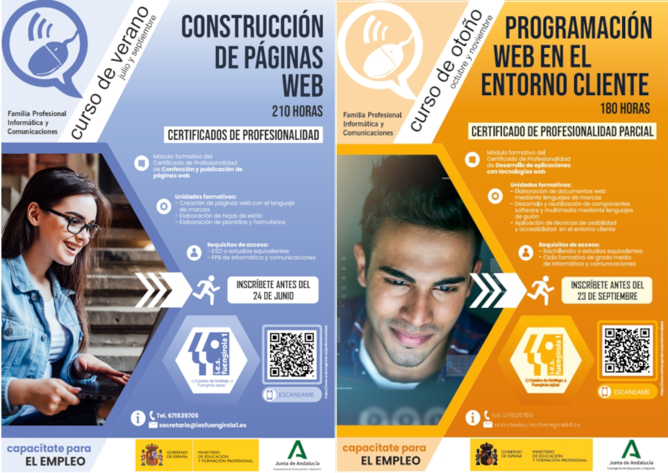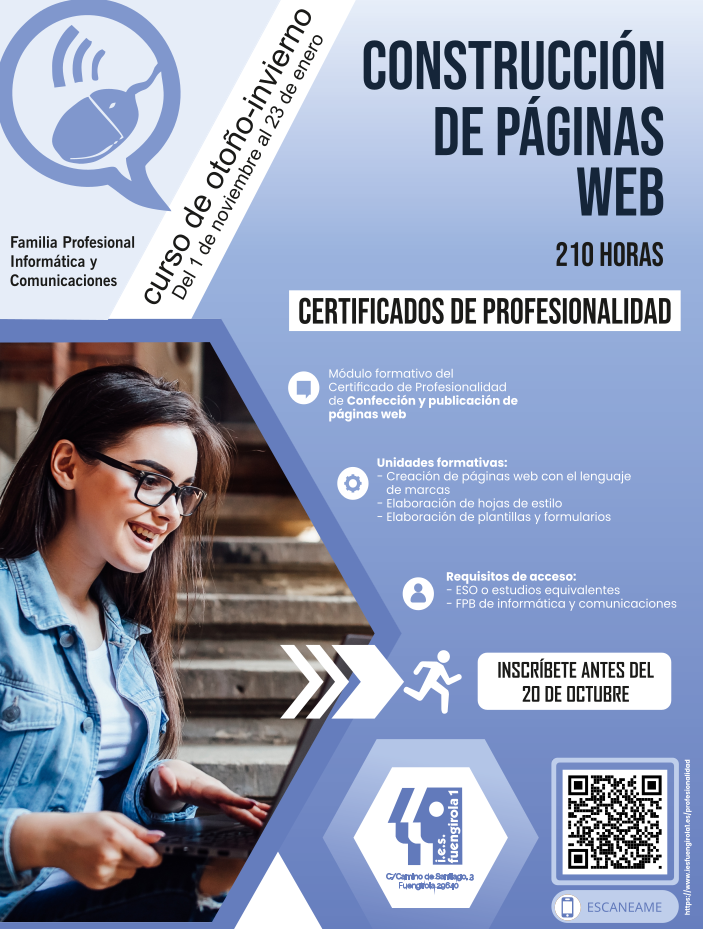 El IES Fuengirola Nº1 te ofrece la posibilidad de la obtención de un certificado de profesionalidad parcial de la familia profesional de Informática y Comunicaciones, «Construcción de páginas web». Gracias a este módulo te capacitarás para obtener empleo en uno de los sectores laborales más demandados actualmente, aprendiendo de una manera práctica y sencilla a confeccionar tus propias páginas web, tiendas virtuales, blogs personales, etc …